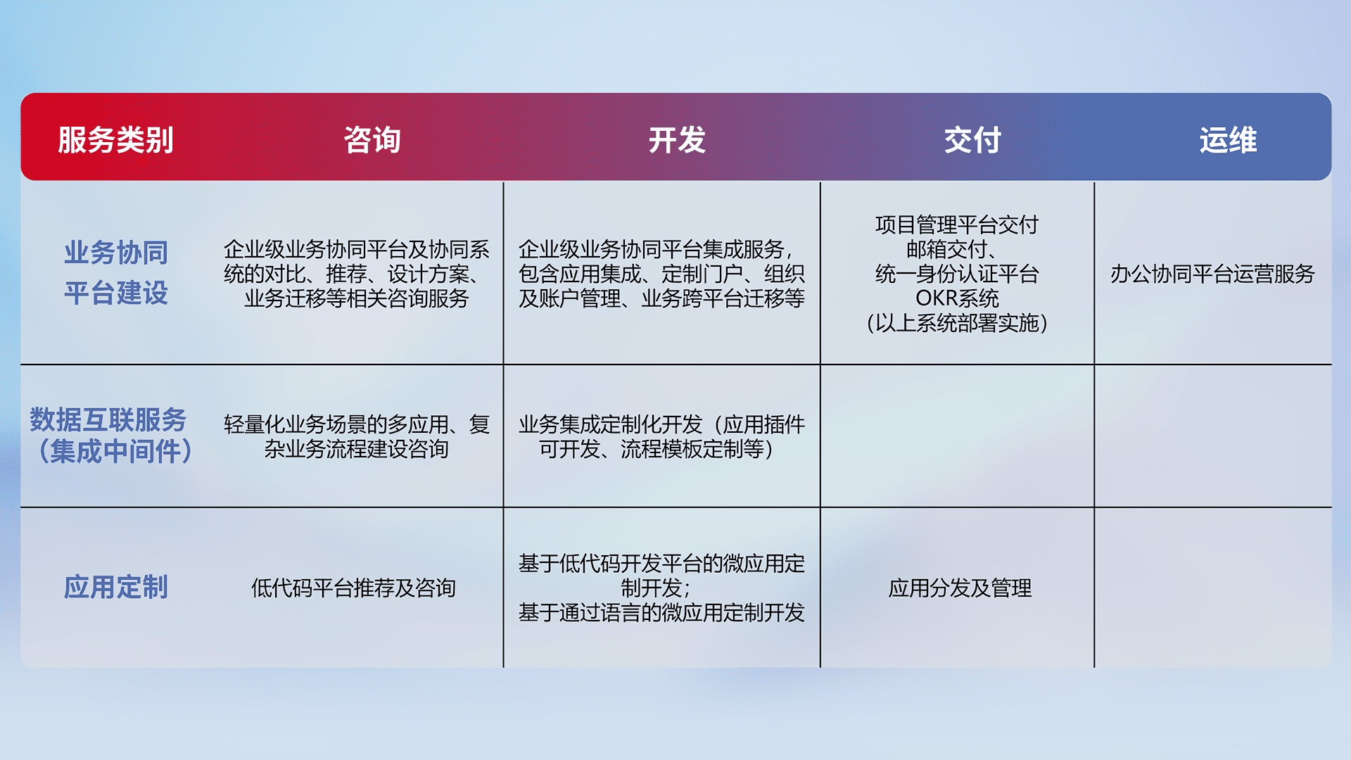 针对钉钉、、、企微、、、、IDaas等平台级产品提供产品的规划、、、方案、、、、交付、、、、定制化开发等服务,,,,实现如统一协同办公、、、、智能客户服务、、混合会议管理、、、、智能数据查询、、、、等业务场景,,,,实现数字化转型。。。